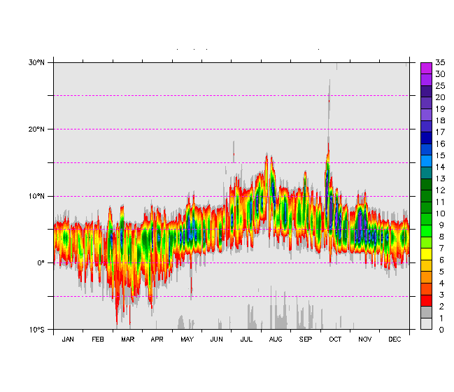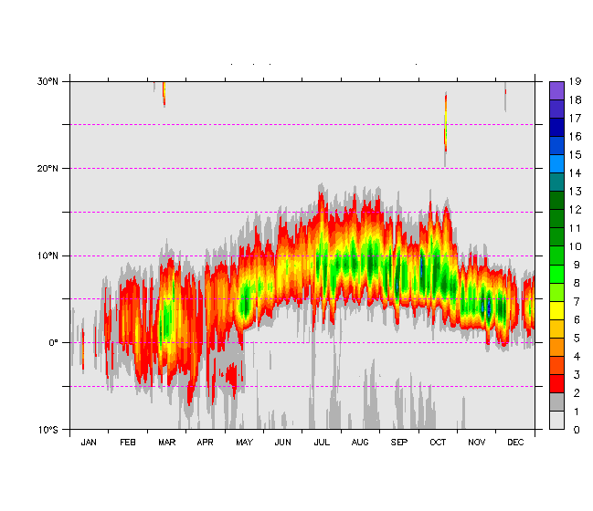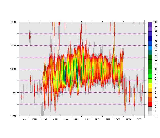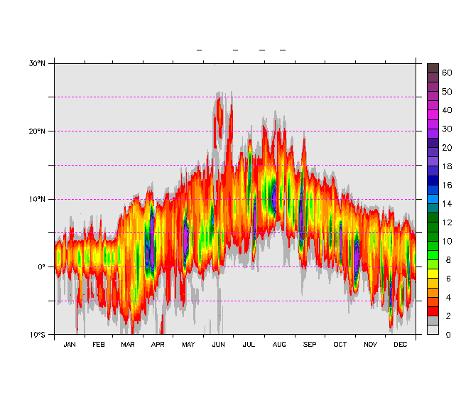 The AMMA-Cross part is dedicated to the mean latitudinal structure of the monsoon. It is motivated by the relative "zonallity" of the west african monsoon. The cross-section consists in zonal averages of model outputs taken from 10°W to 10°E. The latitudinal domain is 20°S-40°N.